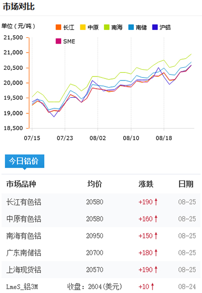 鋁錠價格今日鋁價2021-08-25